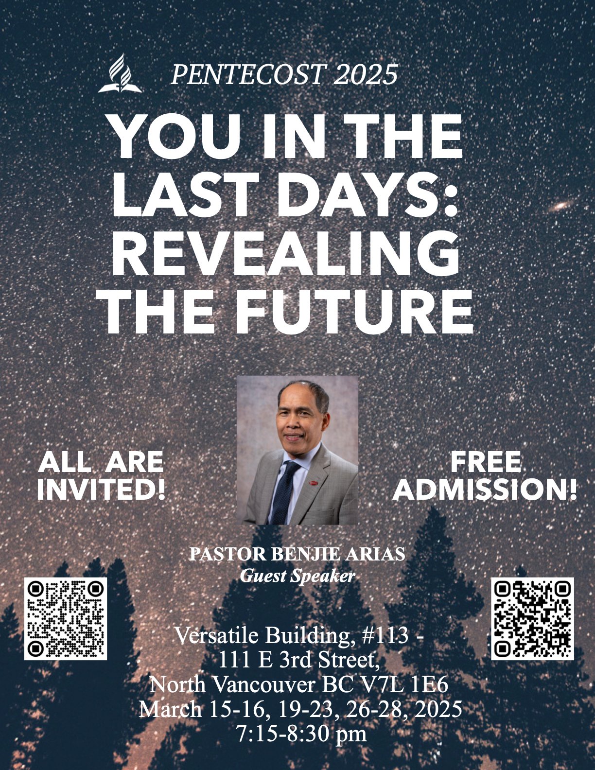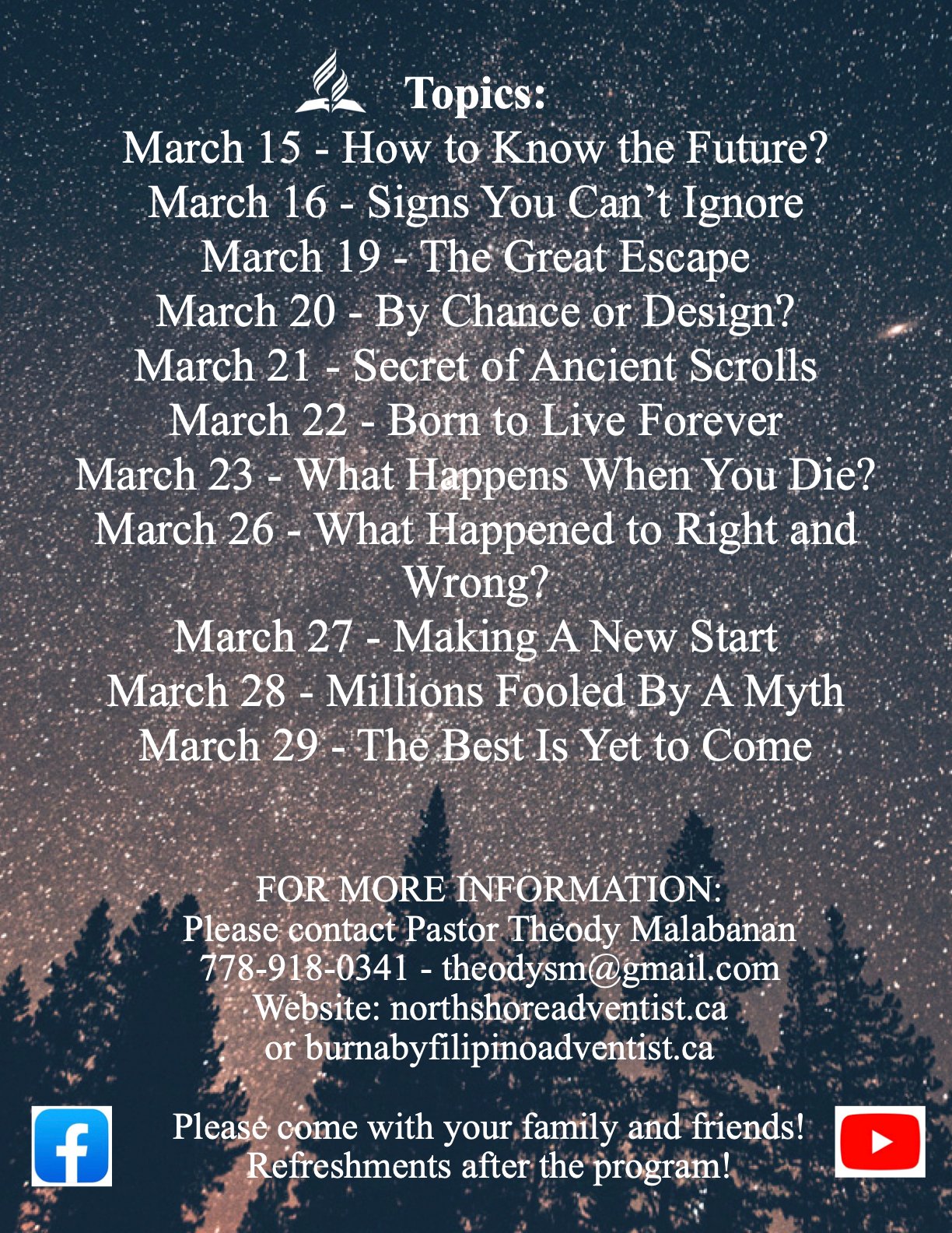 Our church is hoping that many more people may be reached by God’s message through Pastor Cordero as we posted the recordings of the programs on the Burnaby Filipino-Canadian SDA Church YouTube channel and Burnaby Fil-Can on Facebook. We want to hold on to the promise of the Lord in the verses, “Trust in the Lord with all your heart, And lean not on your own understanding. In all your ways acknowledge Him, And He shall direct your path.” Proverbs 3:5-6