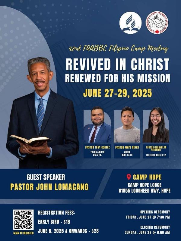 Pastor John Lumacang is 3ABN Director of World Evangelism, and hosts several 3ABN programs, also vocalist was the guest speaker of the 2025 camp meeting with the theme “Revive in Christ, Renewed for His Mission”. Pastor Tony Cortez, speakers for young adult, Pastor Matt Reyes, for the Youth and Pastor Chermilyn Pedernal for the children respectively.
